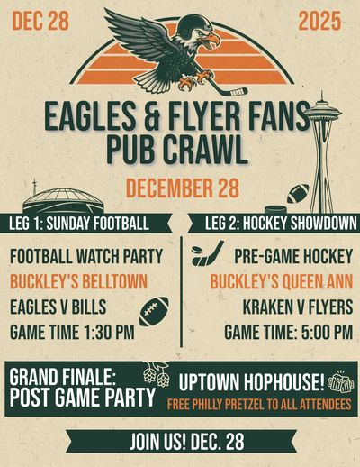 If you’re a die-hard Eagles or Flyers fan—or just love a good time—mark your calendar for December 28th! We’re bringing the Philly spirit to Seattle with an epic pub crawl that combines football, hockey, great drinks, and even better company. Here’s how the day unfolds: